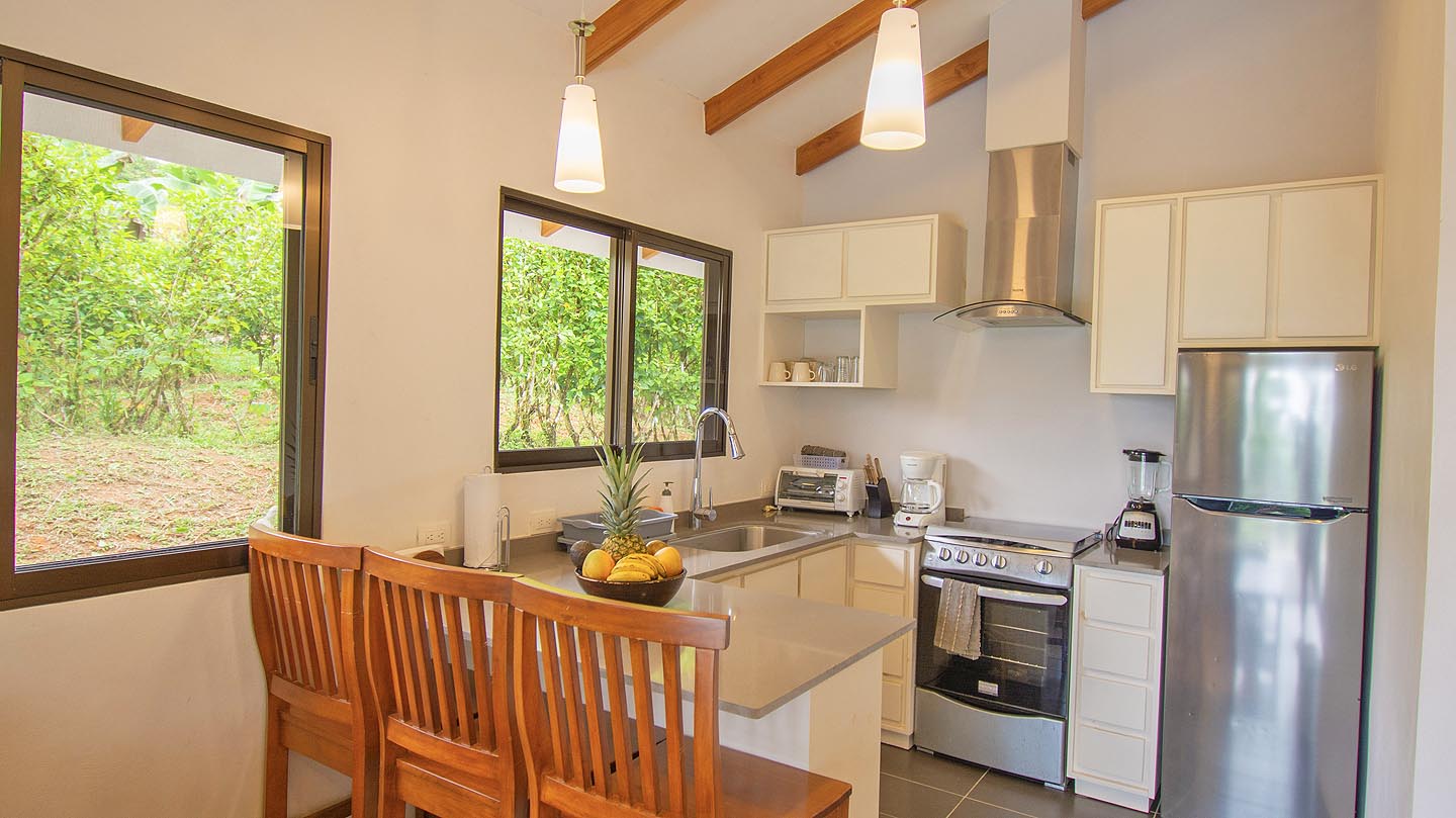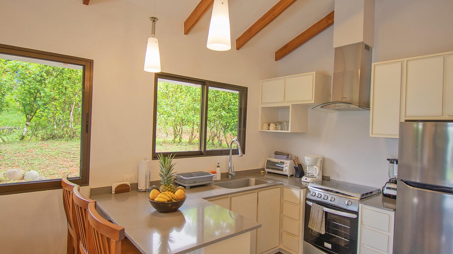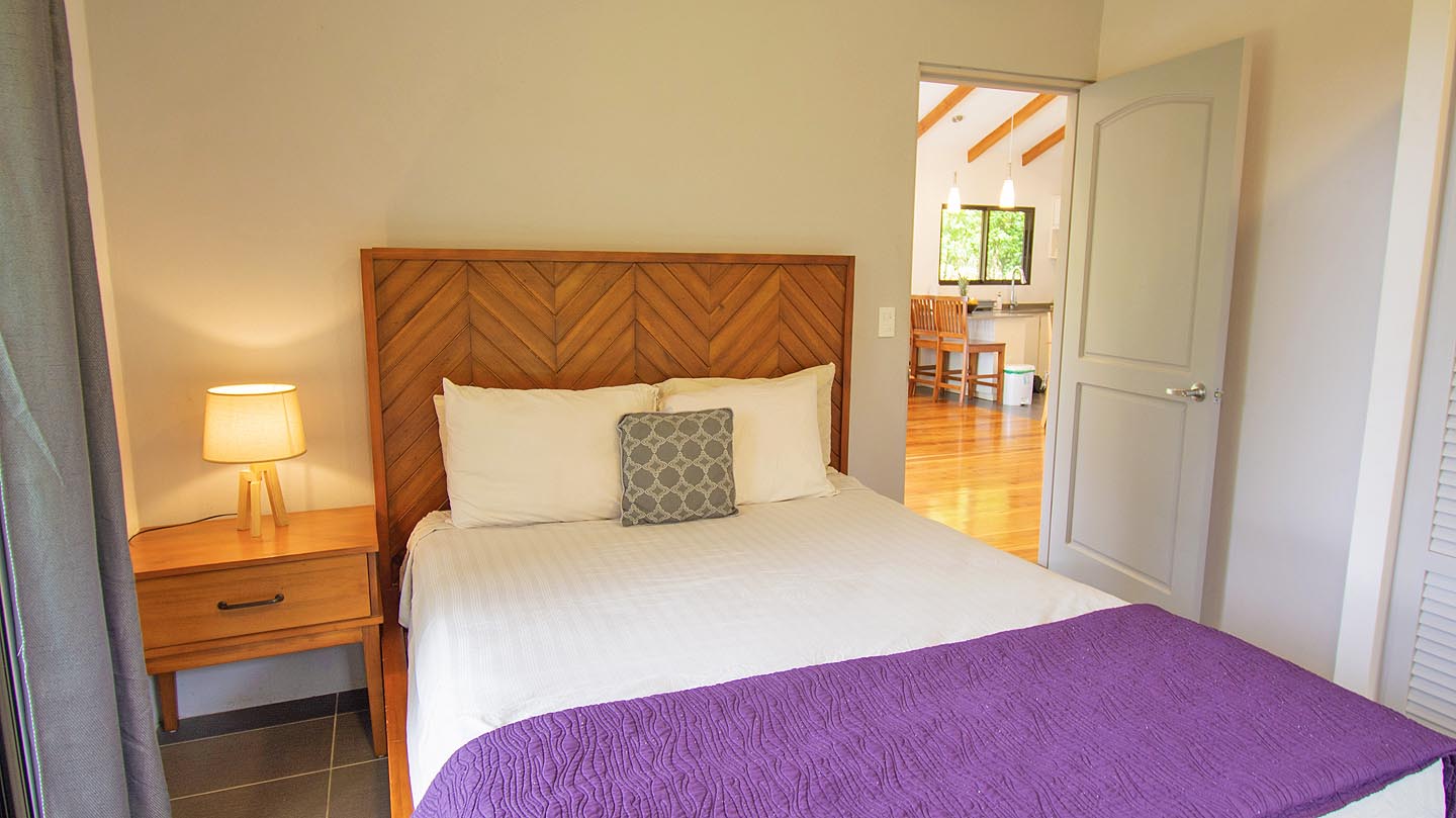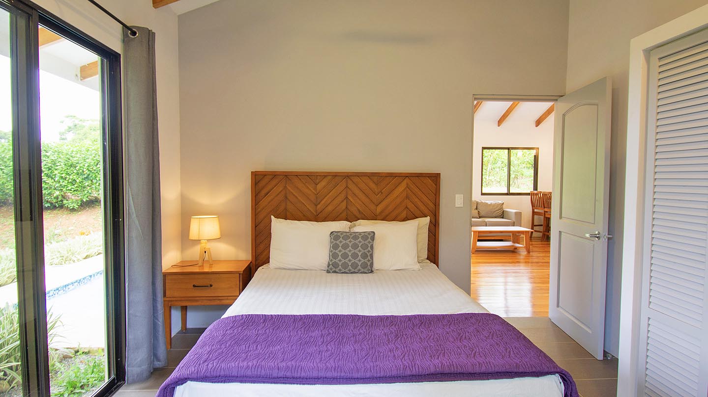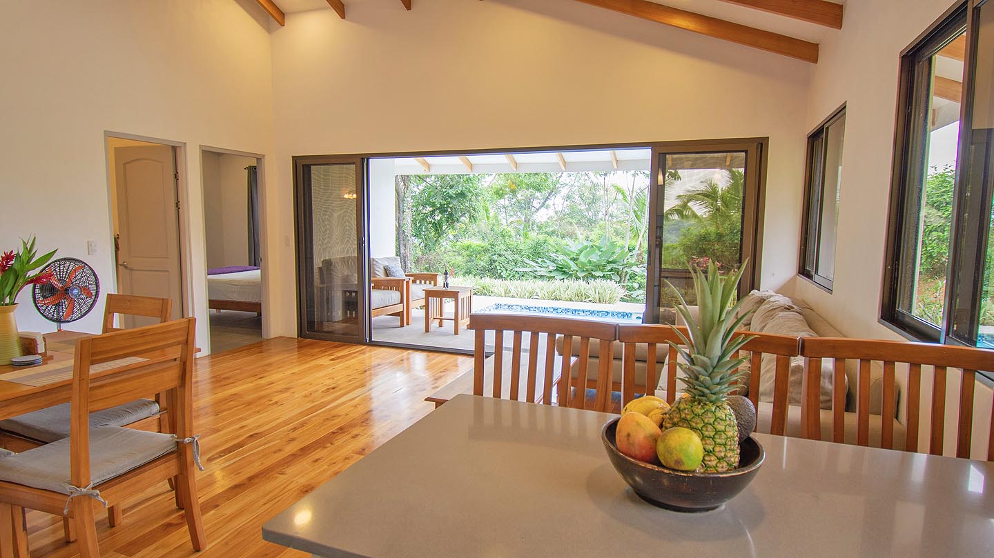 Made up of a master bedroom with queen bed and a second bedroom with 2 single beds. The house has a shared bathroom and is ideal for a group of 4 people or less. The nicest feature of this house is having the option to open the entire pool facing glass wall. The lovely cooling breeze is constant, making it a comfortable temperature throughout the day, and at night you might even wish to use a blanket! The open concept and vaulted ceiling of the kitchen and living space is also great for keeping the interior at cool temperatures so no air conditioning is ever needed.