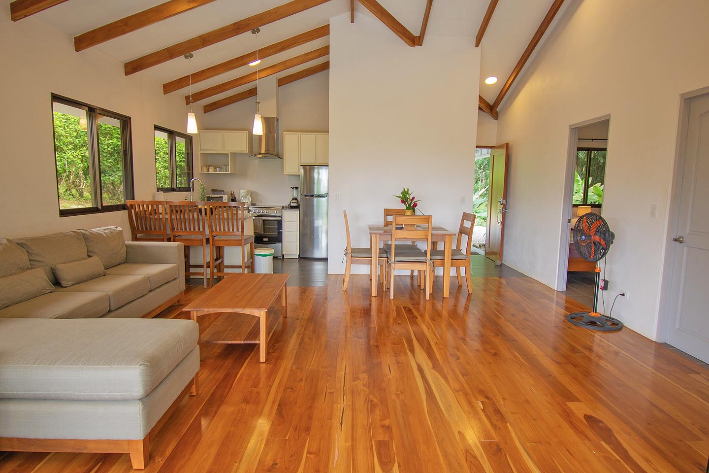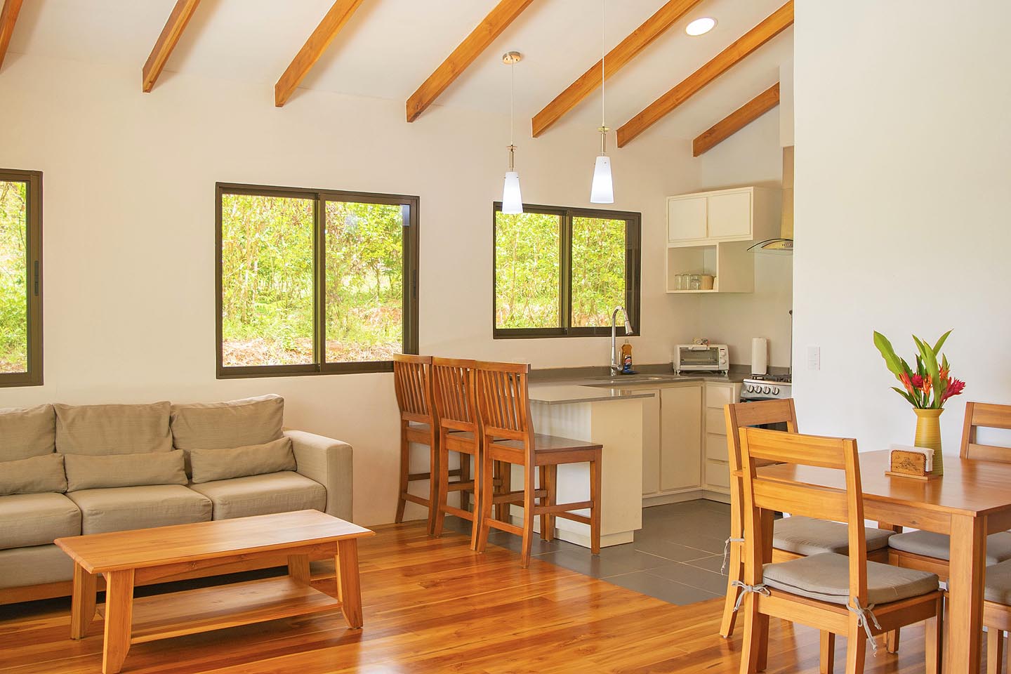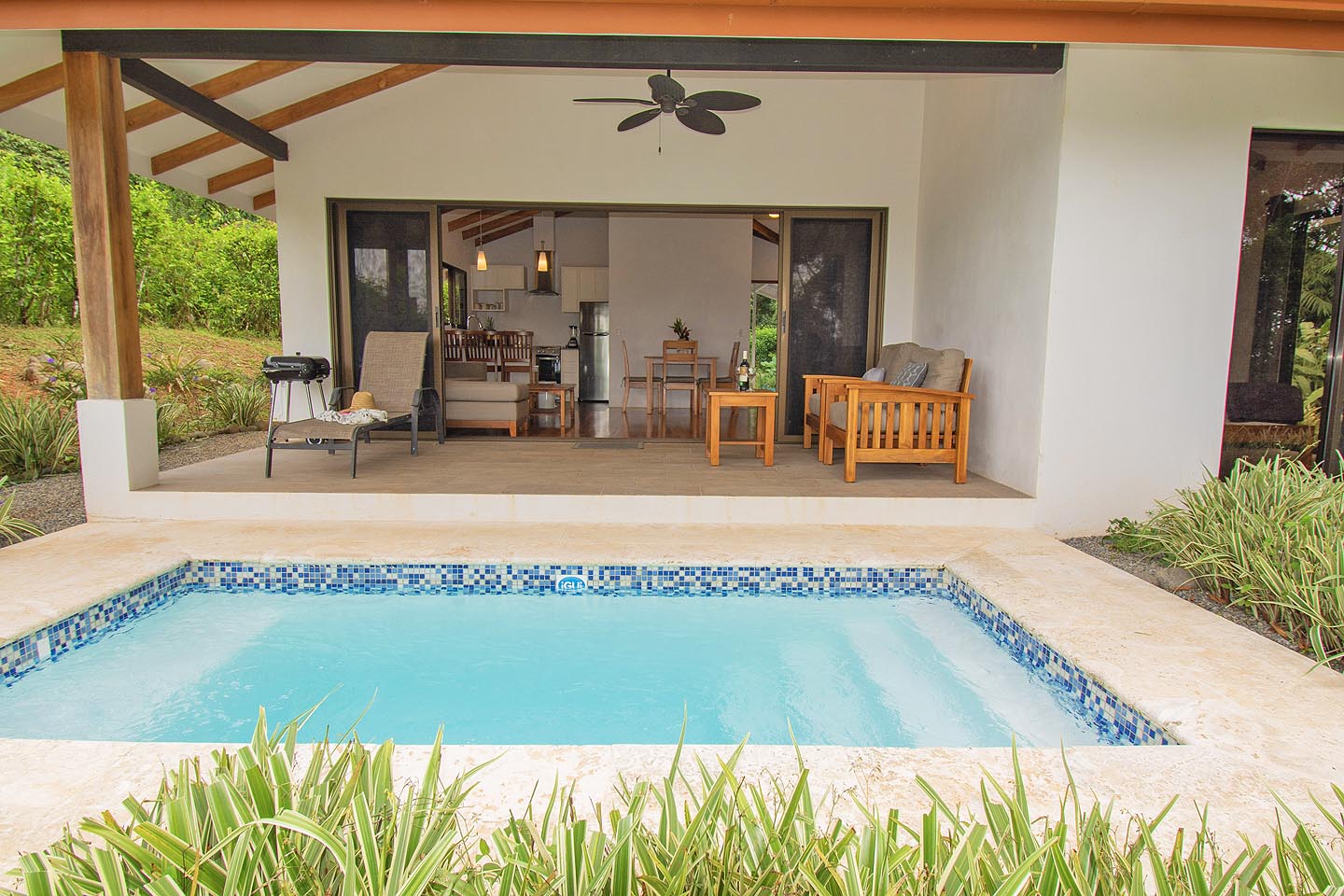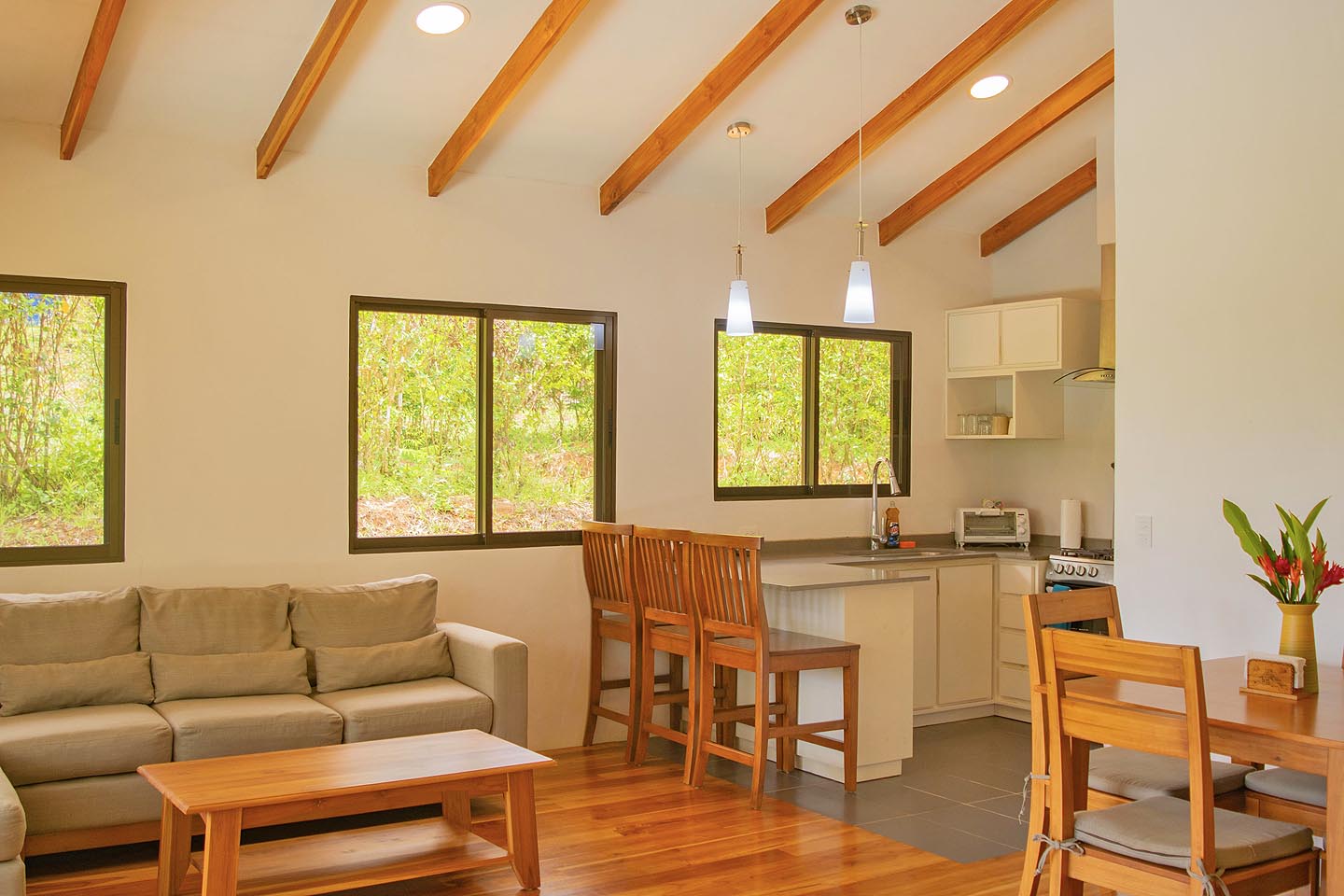 Made up of a master bedroom with queen bed and a second bedroom with 2 single beds. The house has a shared bathroom and is ideal for a group of 4 people or less. The nicest feature of this house is having the option to open the entire pool facing glass wall. The lovely cooling breeze is constant, making it a comfortable temperature throughout the day, and at night you might even wish to use a blanket! The open concept and vaulted ceiling of the kitchen and living space is also great for keeping the interior at cool temperatures so no air conditioning is ever needed.