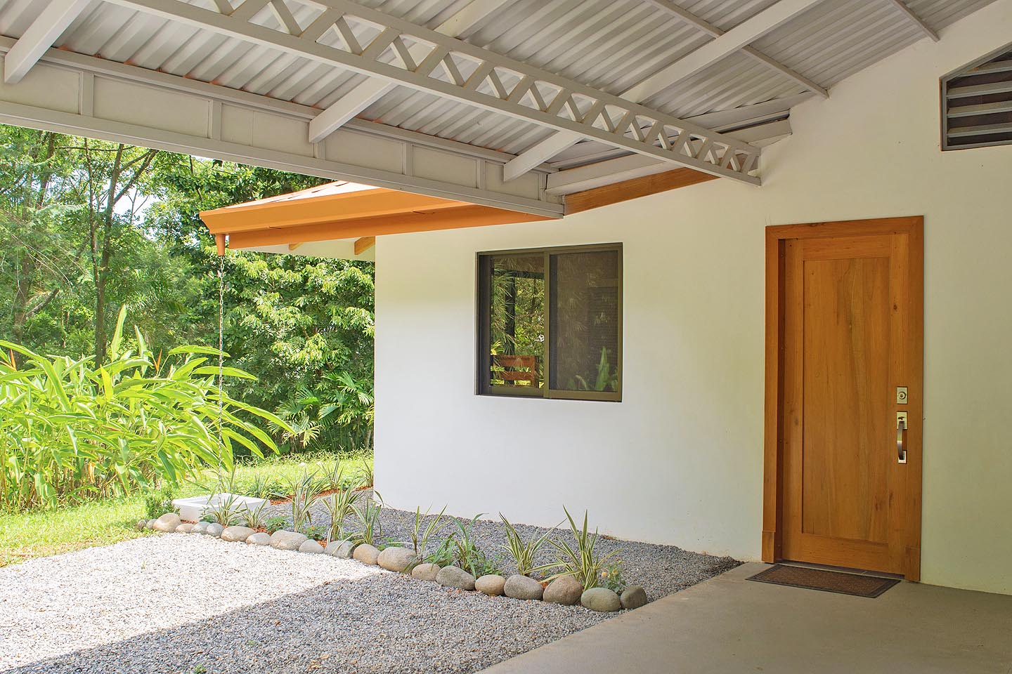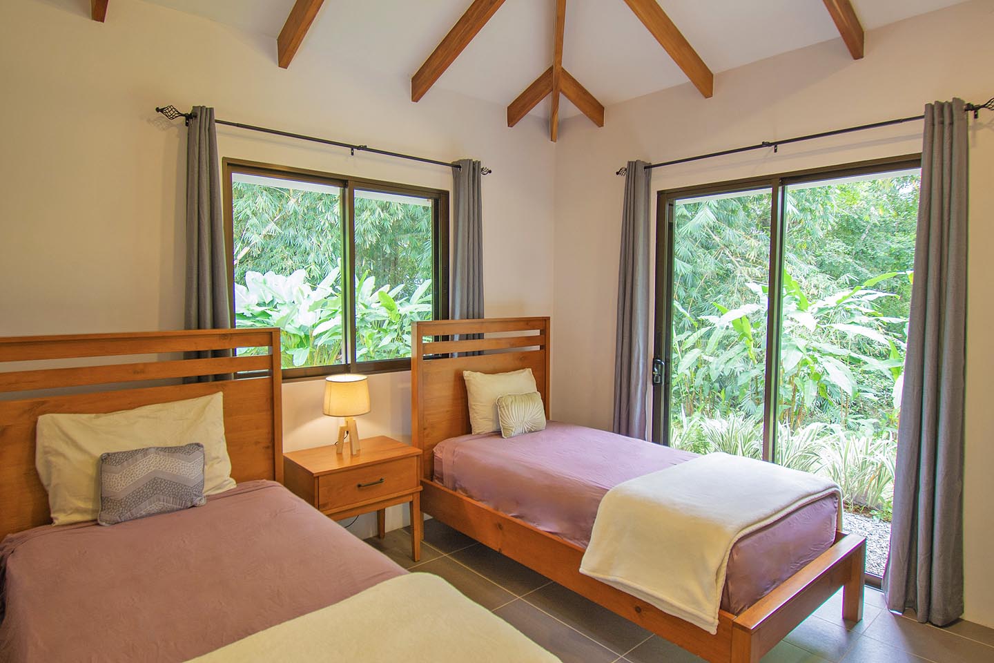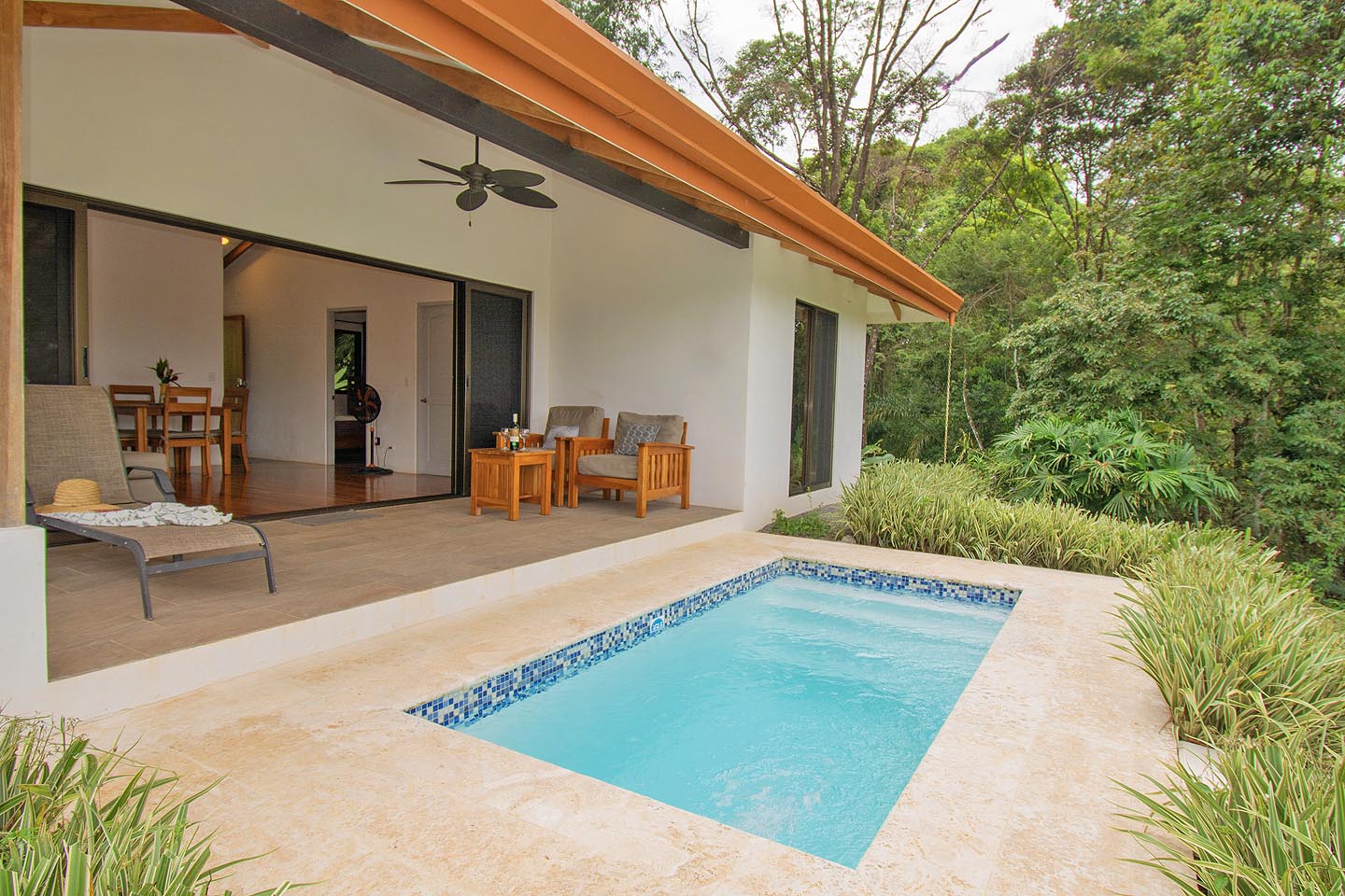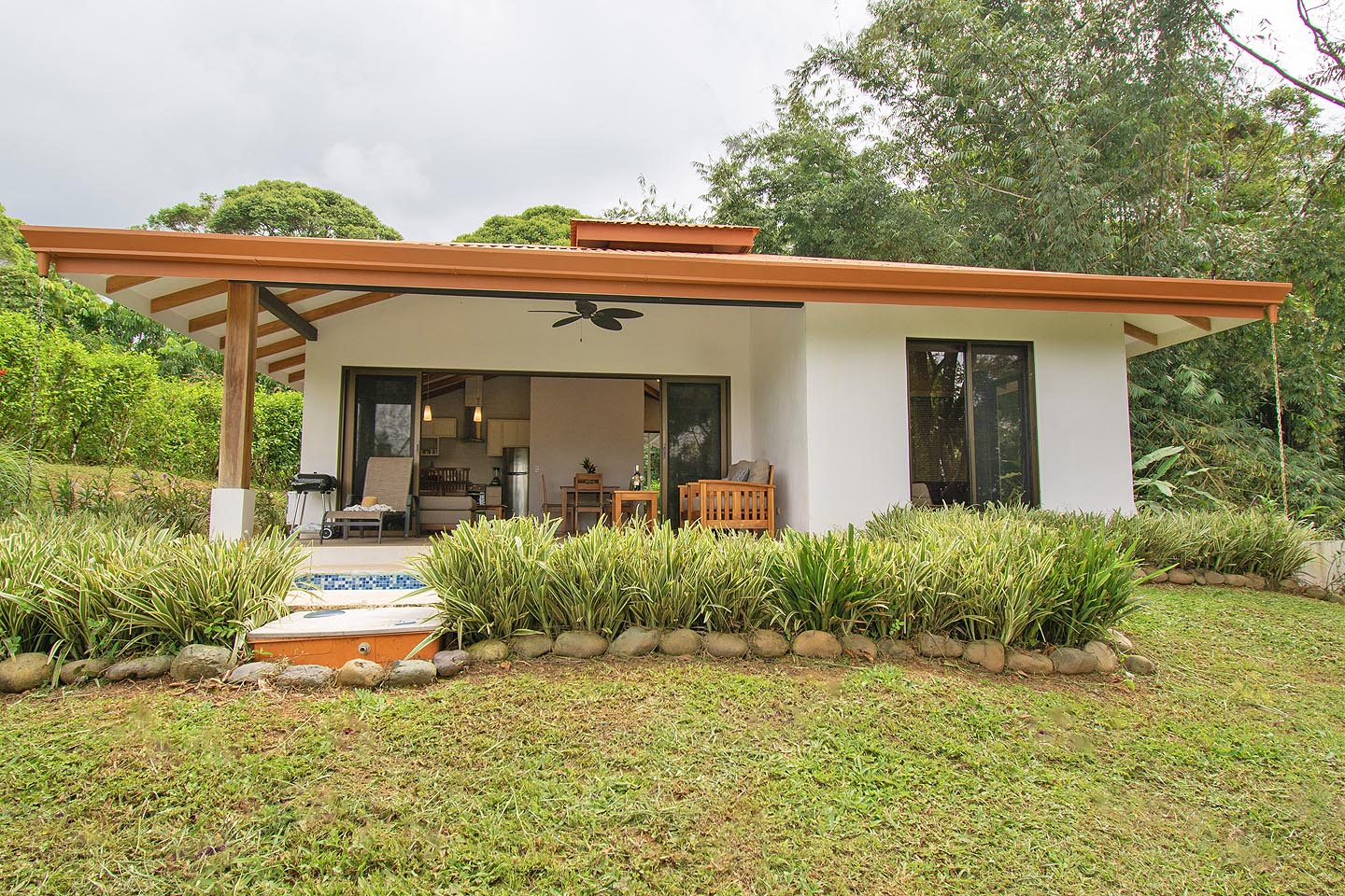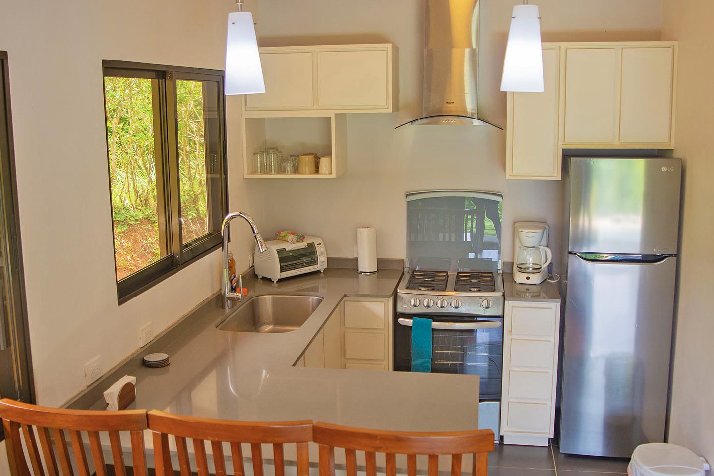 Made up of a master bedroom with queen bed and a second bedroom with 2 single beds. The house has a shared bathroom and is ideal for a group of 4 people or less. The nicest feature of this house is having the option to open the entire pool facing glass wall. The lovely cooling breeze is constant, making it a comfortable temperature throughout the day, and at night you might even wish to use a blanket! The open concept and vaulted ceiling of the kitchen and living space is also great for keeping the interior at cool temperatures so no air conditioning is ever needed.