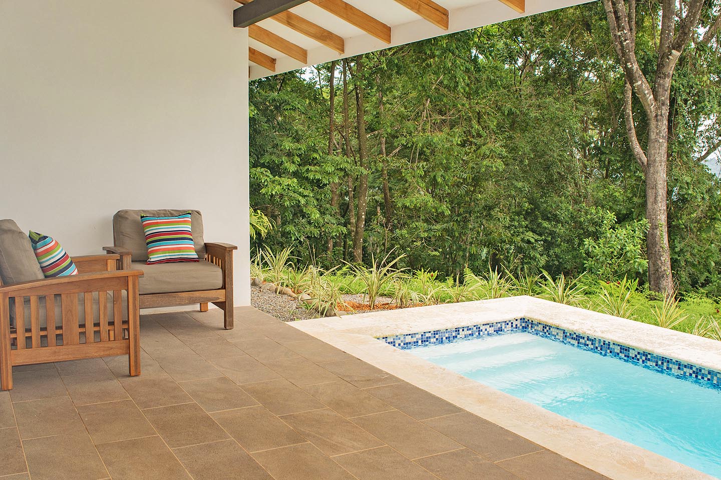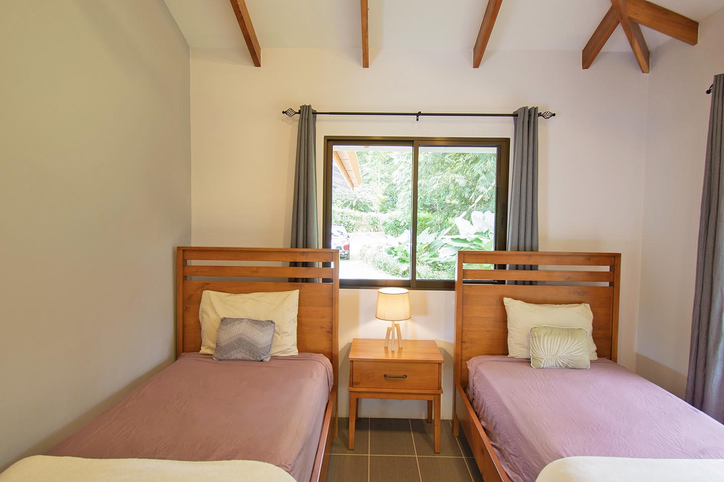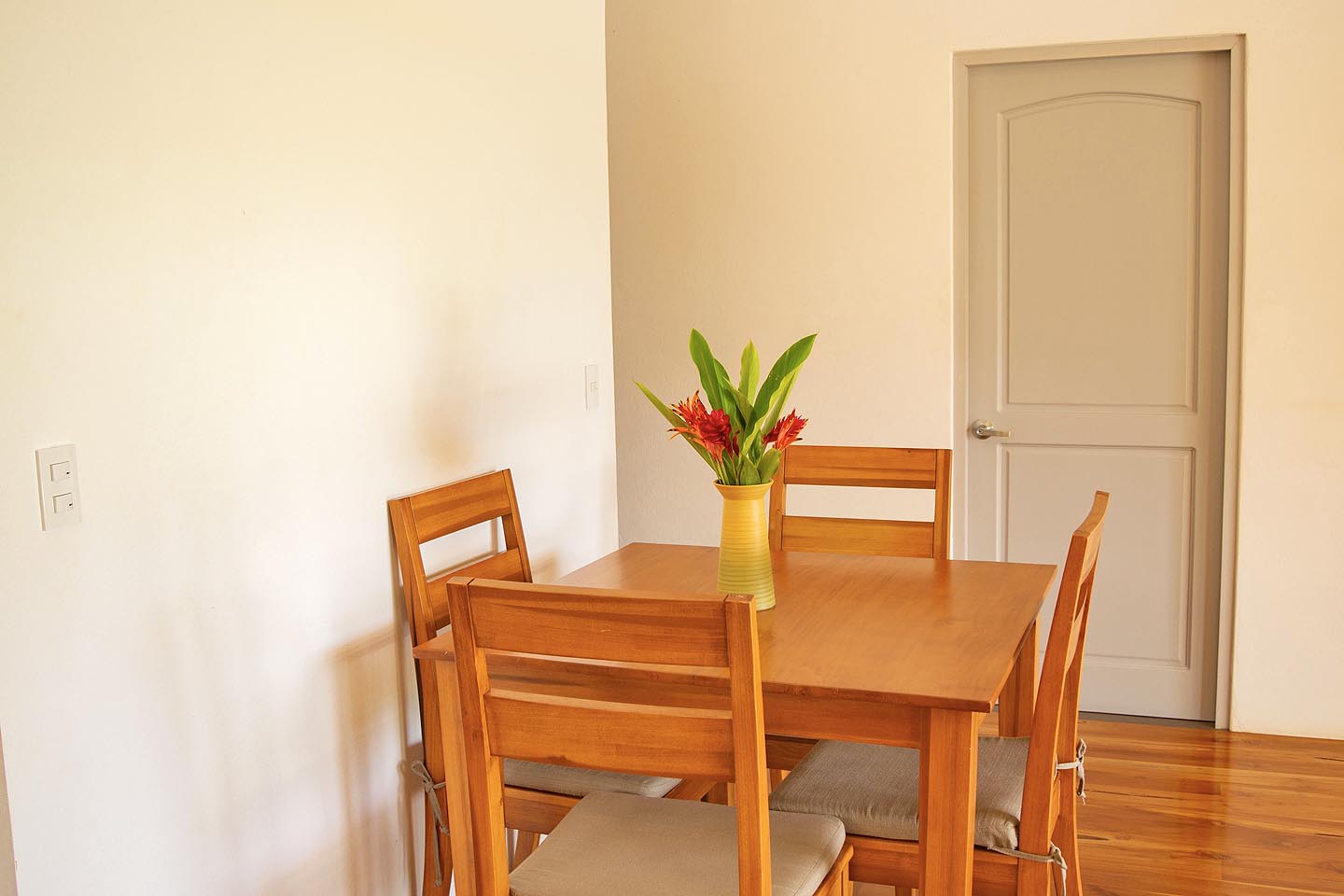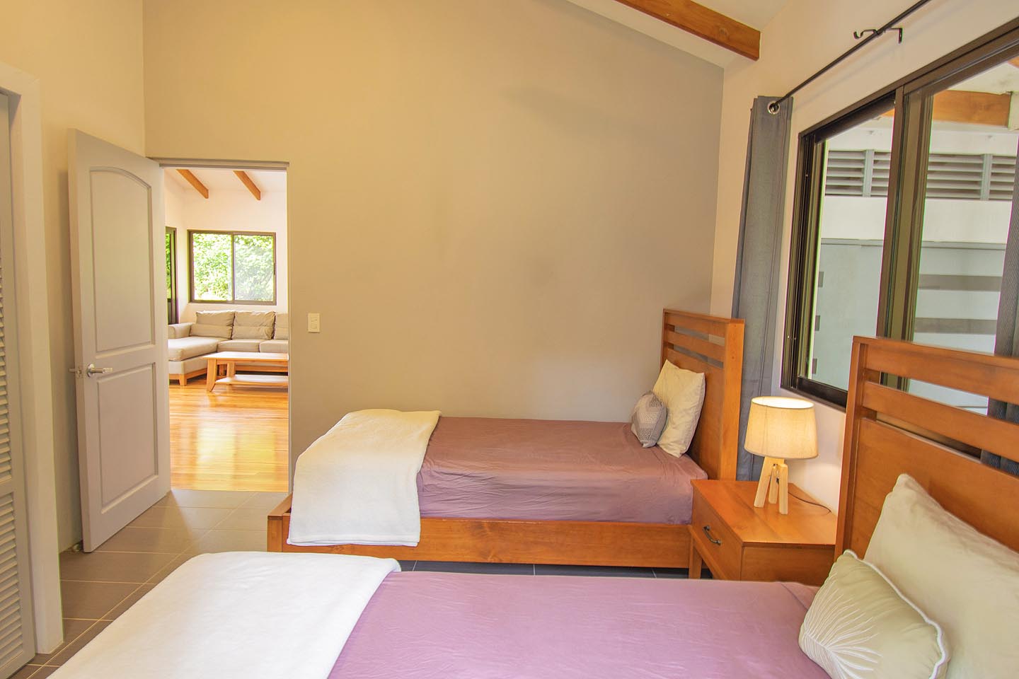 Made up of a master bedroom with queen bed and a second bedroom with 2 single beds. The house has a shared bathroom and is ideal for a group of 4 people or less. The nicest feature of this house is having the option to open the entire pool facing glass wall. The lovely cooling breeze is constant, making it a comfortable temperature throughout the day, and at night you might even wish to use a blanket! The open concept and vaulted ceiling of the kitchen and living space is also great for keeping the interior at cool temperatures so no air conditioning is ever needed.