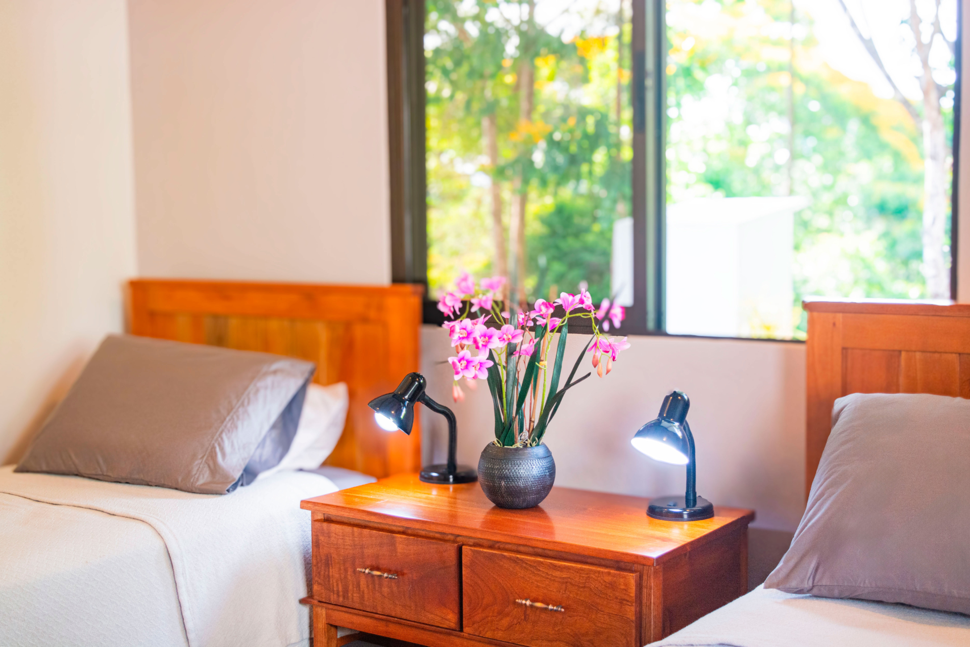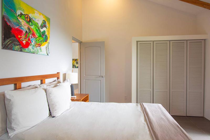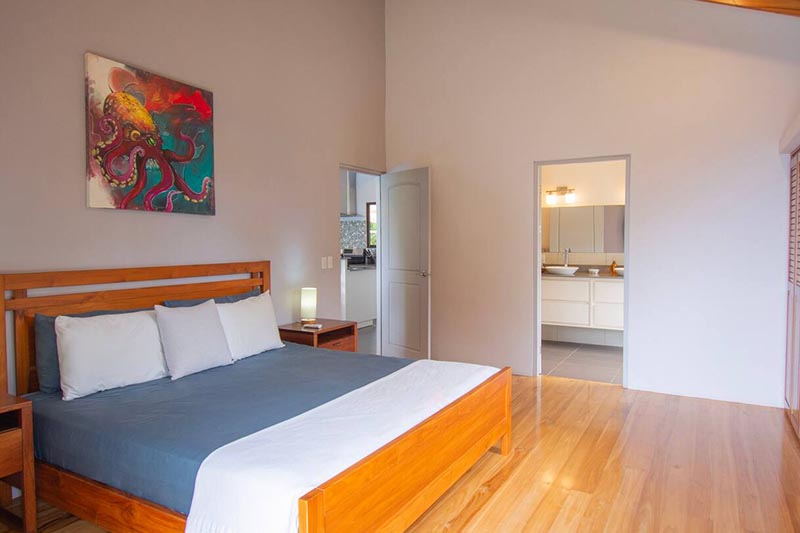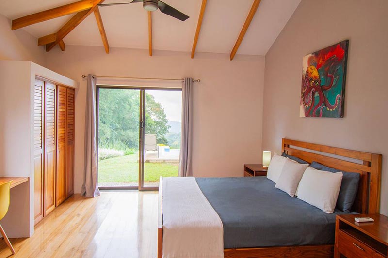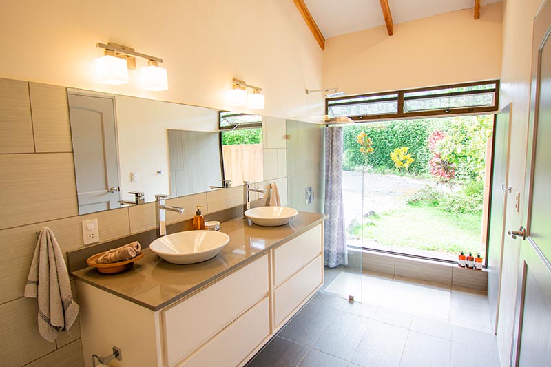 The three smartly spaced out bedrooms consist of one master bedroom with a king bed, en-suite bathroom which has two sinks, large closet with a work space, and private access to the pool area as well as ocean views. The second bedroom is made up of one queen bed, plenty of closet space, its own access to the pool area as well as ocean views. A shared bathroom is located between the second and third bedroom. You will find two twin beds and a large closet in the third bedroom, with windows that look into the jungle forest.